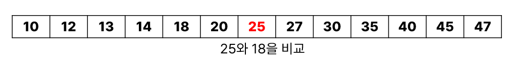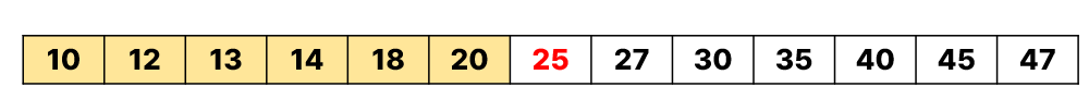 리스트가 이미 정렬이 되어있으므로 25 이후(오른쪽)의 숫자를 볼 필요가 없다. 이제 25의 왼쪽 숫자들만 볼 것이다.